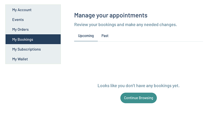Under My account, the customer can see My Bookings, but on this page it says they don’t have any upcoming or past bookings. There’s a button on the page to Continue Browsing, but it takes them to the home page.