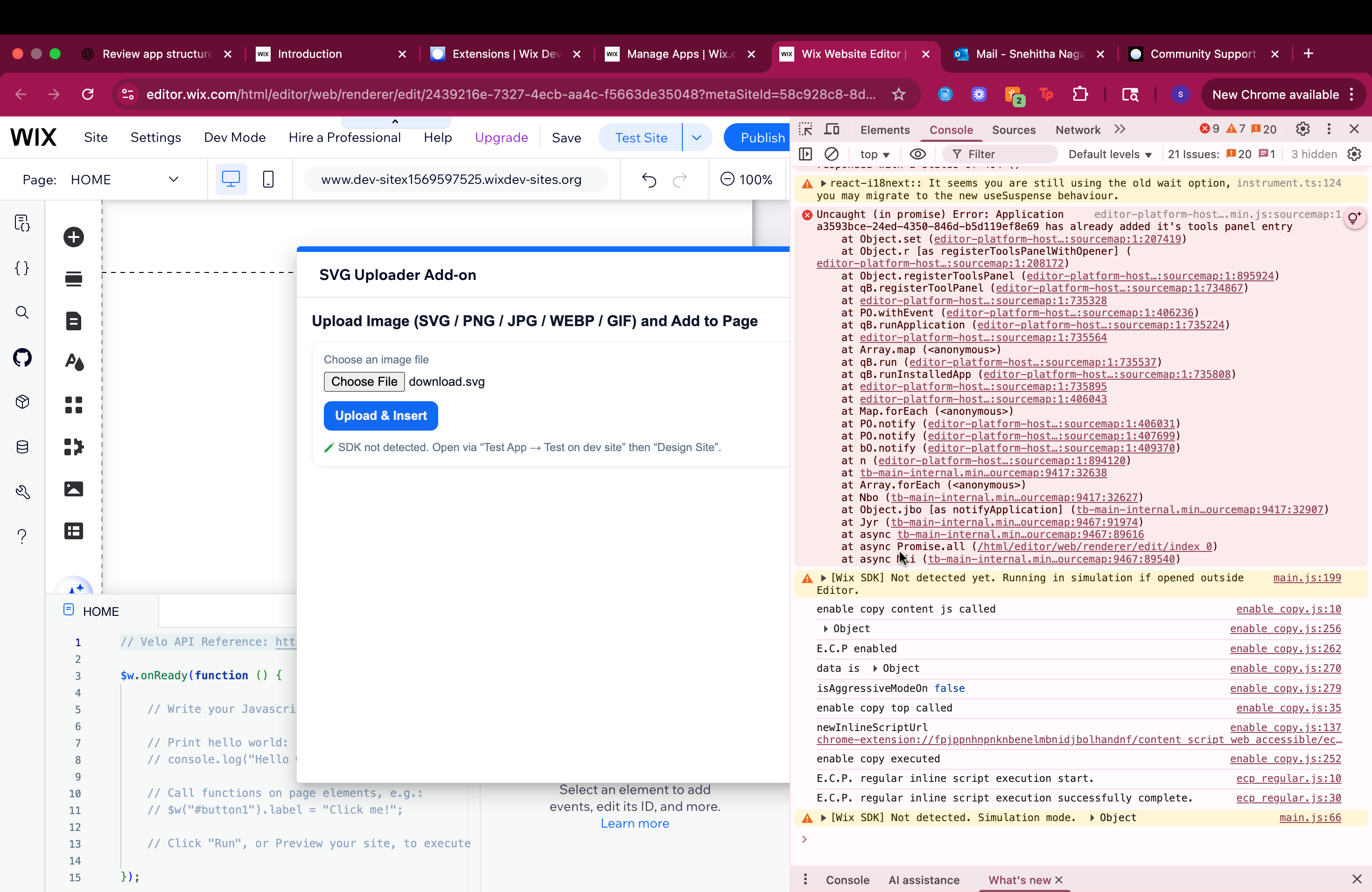 I’m developing a custom Editor Add-on panel for Wix Studio using Vite (served locally via ngrok). The panel loads correctly inside the Editor, but the Wix SDK is not detected. The console shows: