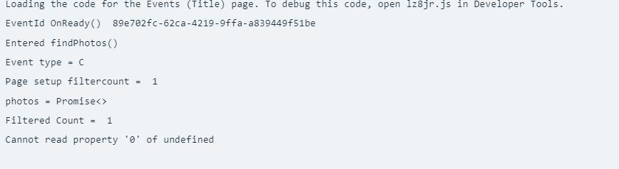 I have a database with a table called events and I have a repeater that shows the events. There is another table called photographs that links to the events table. One event to many photographs. I am trying to populate my Event Item page with data coming from the Photographs table. The idea is to hide text objects if there are no photographs but if photographs are linked to an event and the event is a competition then the text objects will be shown and the text values will be populated with the names of the winners of the competition. There should be only 2 winning photographs one from the advanced and the other from the standard section. The top scoring photos will be displayed in a gallery that will be linked to the text objects. Regrettably I cannot get this to work I have tried lots of different ways. Originally I tried to create a function that ran a data query, the idea was to use the results of the query but I had no success with that even when I made the methods asynchronous. I then decided to add a dataset to the page to hold the photographs that I would filter based on the event and a Boolean flag called winner. I had 2 methods that would be called inside the onReady() of the events and nested photographs datasets. I have successfully returned the correct photograph from my data but I cannot get the information from the photograph instead it reads the photograph as undefined. This is the code I am using -